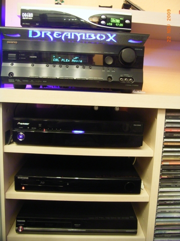 In Planung sind jetzt noch die Funkschaltung der Deckenlampe, die Aufrüstung auf 7.1(wahrscheinlich mit Heco Victa 200. da die AR baugleich sind mit den Heco Concerto, die ich als Vorläufer der Victa sehe, sollte das klanglich passen), und evtl. die Verlegung des Displays der DREAM an die Front des TV