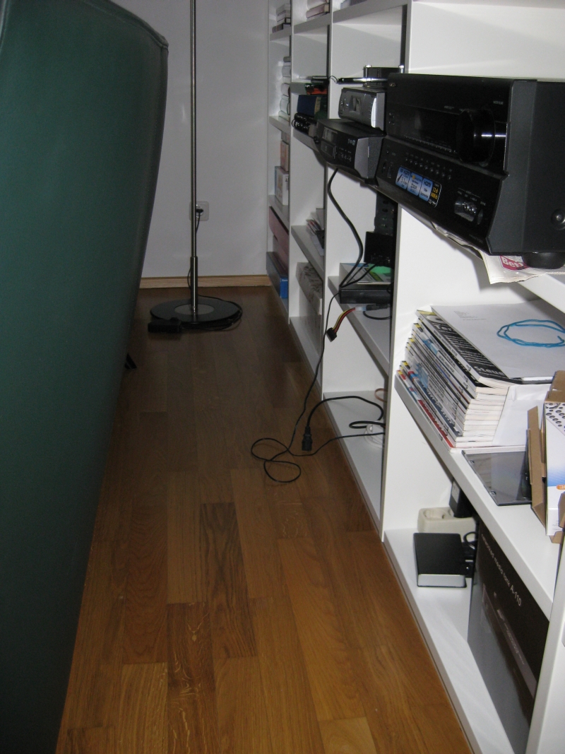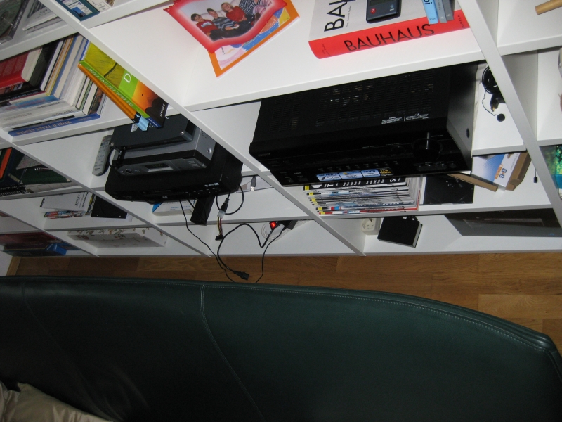 Habe ein Wohnzimmer 6x4m. Sitze auf der Couch und schaue zu einem Fenster. Ander Seite ist ein TFT und fürs Kino wird vor das Fenster eine Leinwand gezogen. Alles soweit prima. Nur die Geräte stehen hinter der Couch in einer Bücherwand und sollen möglichst sogar noch ein oder zwei Regalfächer weiter runter (siehe Bilder).