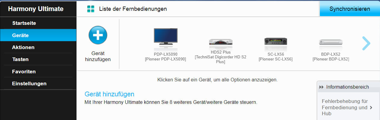 Maximal können 6 Harmony's in einem Konto verwaltet werden und zu jeder Harmony wird angegeben, wieviele Geräte und Aktionen jeweils vorhanden sind.