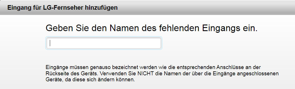 Um einen Eingang zu korrigieren, klicken wir auf Eingang korrigieren und wählen danach den gewünschten Eingang aus: Auch hier können wir nun entscheiden, ob wir einen bestehenden Befehl verwenden (obere Auswahl) oder den fehlenden Befehl von der Original-Fernbedienung anlernen wollen (untere Auswahl): Beim Anlernen wird ein neuer Befehl mit dem Namen des Eingangs angelegt. Prüft also vorher, dass es keinen Befehl mit diesem Namen gibt.
