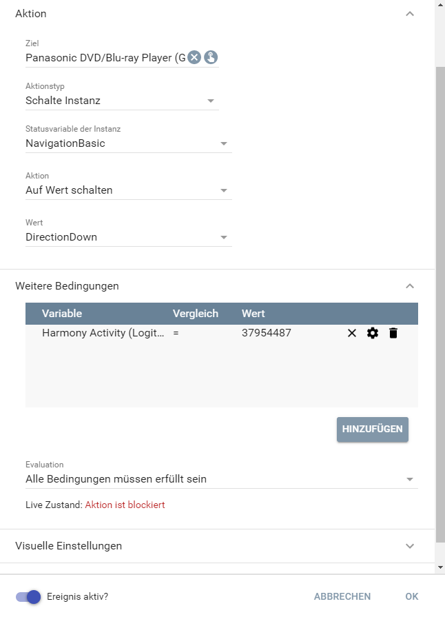 Als Einschränkung wird dort noch auf die Harmony Aktion geprüft, so das auch nur dann zyklisch etwas gesendet ist wenn die Harmony wirklich mit einer Aktion den Bluray Player gestartet hat, wenn der Harmony Hub auf aus steht, wird dann auch nichts zyklisch gesendet.