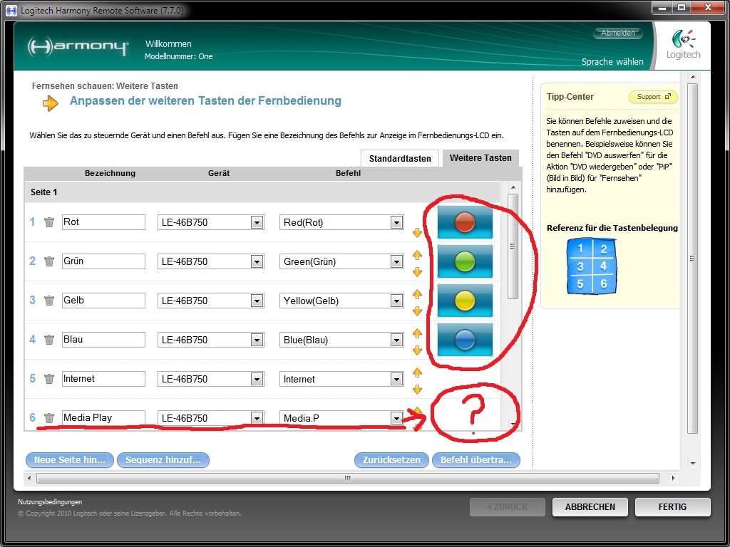 Die Tasten habe ich entsprechend angelernt usw. Alles schick. Sie heißen auch Rot, Grün, Blau und Gelb.