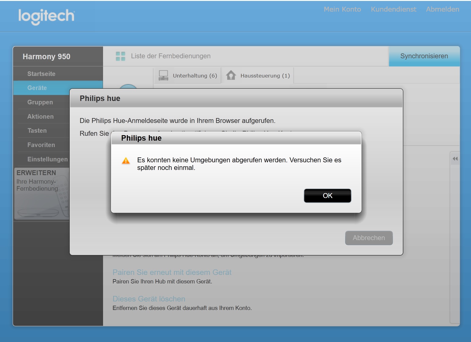 In der Harmony Software kommt dann allerdings eine Fehlermeldung, dass keine Umgebungen abgerufen werden konnte, ich solle es später nochmal versuchen.