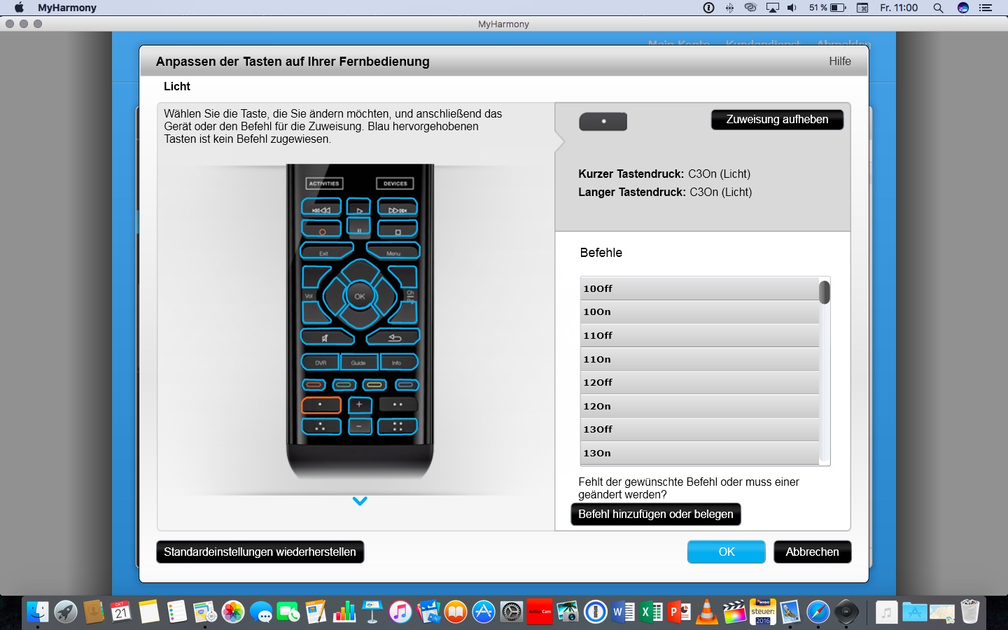 Eventuell musst Du vor dem Schaltbefehl noch zusätzlich das richtige Device anwählen. Du kannst das aber einfach in ein Makro verpacken. Die Definition der Makros ist in der myHarmony-Software direkt neben der normalen Tasten-Belegung als zweiter Reiter verfügbar.