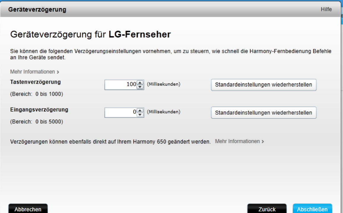 Übrigens sehen die Geräteverzögerungen in der Harmony App für meinen LG recht abgespeckt aus. Man kann nur Tastenverzögerung und Eingangsverzögerung einstellen.