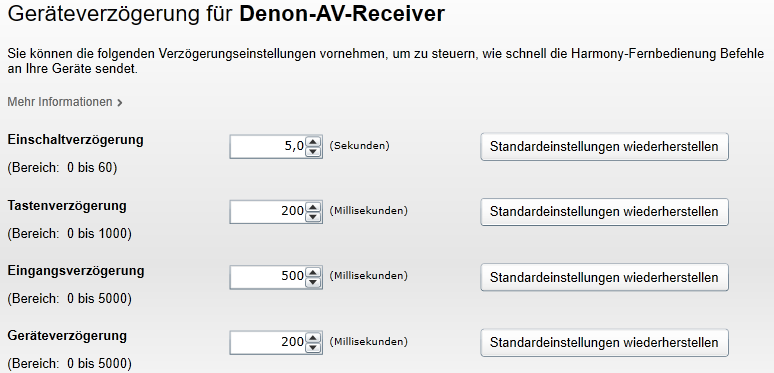 Im Zusammenhang mit der Harmony empfiehlt es sich dann noch, es so einzustellen, dass der MR nicht bei Aktionswechsel, sondern nur über die Aus-Taste ausgeschaltet wird. Dann klappt das Zurückschalten zum MR aus einer anderen Aktion ohne Verzögerung.