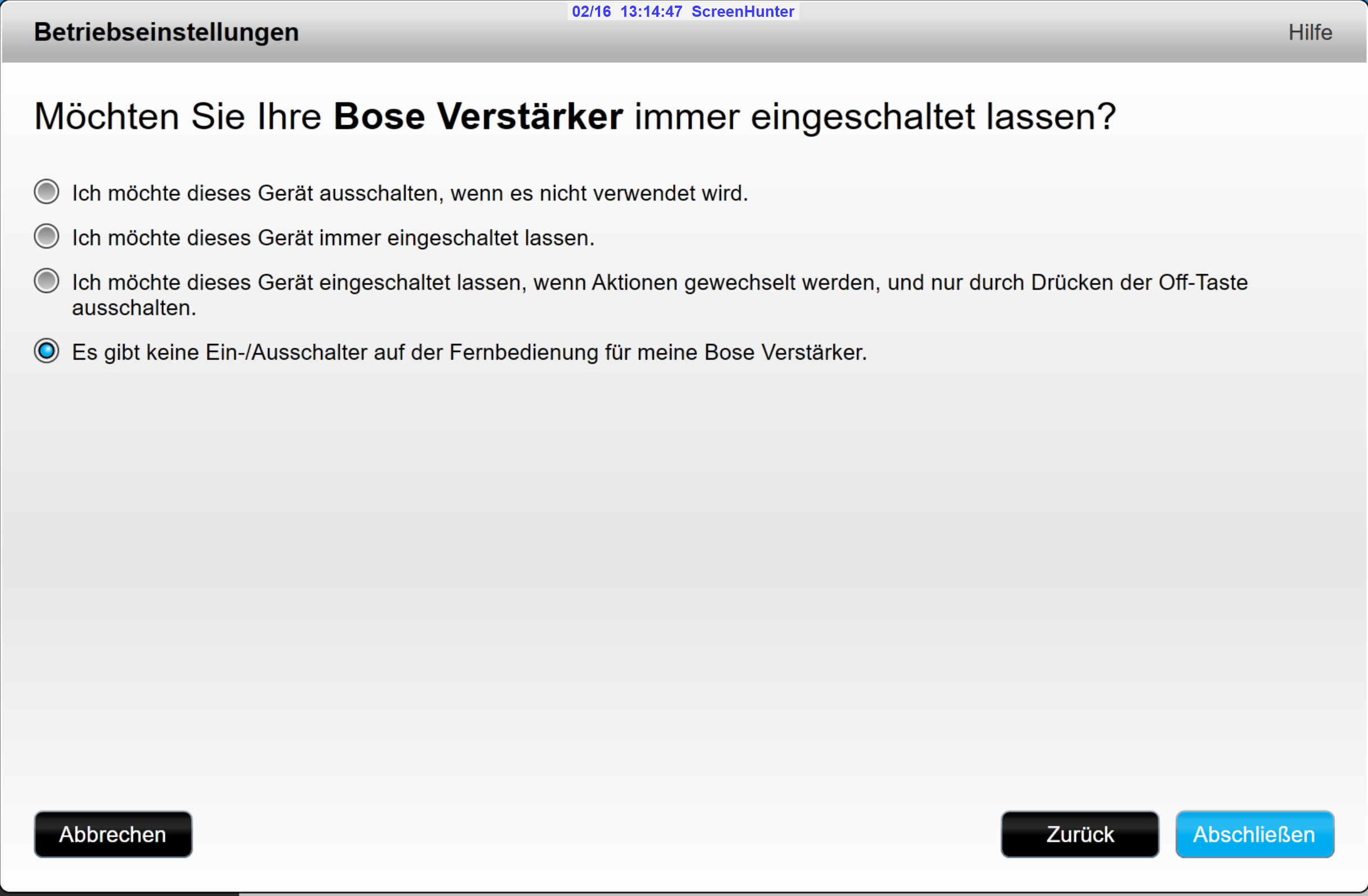 "Ich möchte dieses Gerät immer eingeschalten lassen" (Power on / off bei Start/Ende)