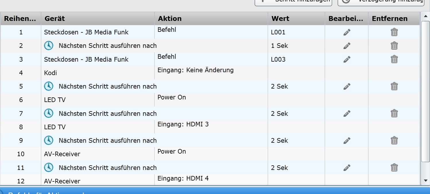Folgendes passiert, dazu hänge ich mal einen Screenshot ein, so ist es auch eingestellt. Aber ich habe das Gefühl, die Reihenfolge wird so nicht abgearbeitet. Die Steckdosen werden erst zum Schluss geschaltet. Somit werden die Befehle an die Geräte wie an, Eingang schalten usw. gesendet, wenn die Geräte noch gar keinen Strom haben.