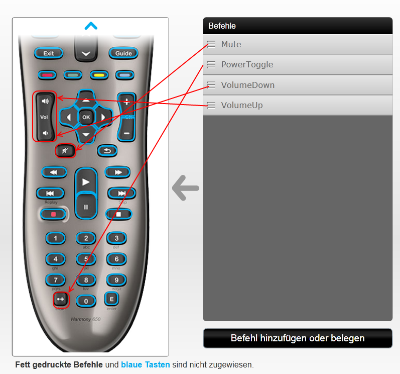 Falls nicht, diese Befehle als neue Befehle unter anderem Namen (z.B. MyVolumeUp, MyPowerToggle, etc.)anlernen.