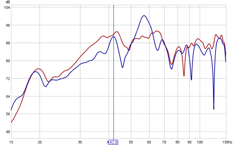 Zuerst der Vergleich ohne und Mit Antimode. Welche Messung ohne ist sollte kla sein ;) Die Mode bei 42Hz fällt gehört deutlicher aus als es hier scheint