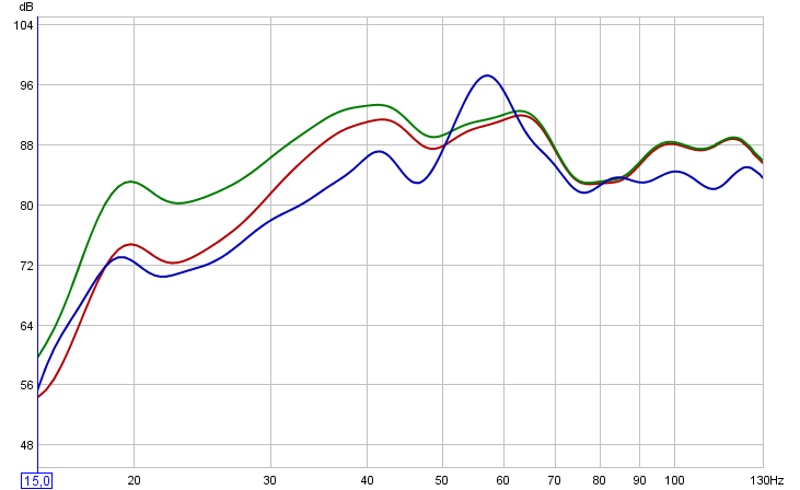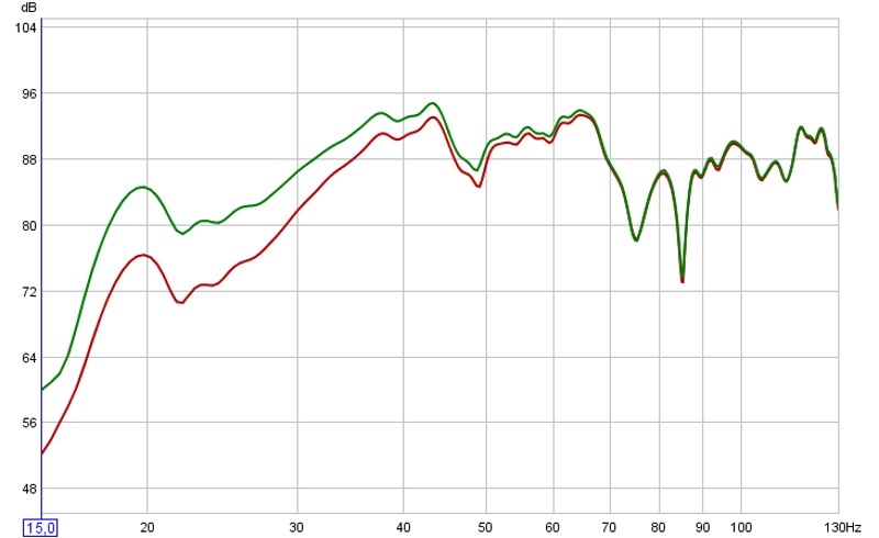 Dann bietet das Gerät Boost25 (hebt zwischen 25 und 35Hz den FG an) und Boost35 (zwischen 35 und 45Hz). Gemessen habe ich nur ersteren. Boost35 wäre kontraproduktiv da ich ja die Raummode um 40Hz bekämpfen wollte