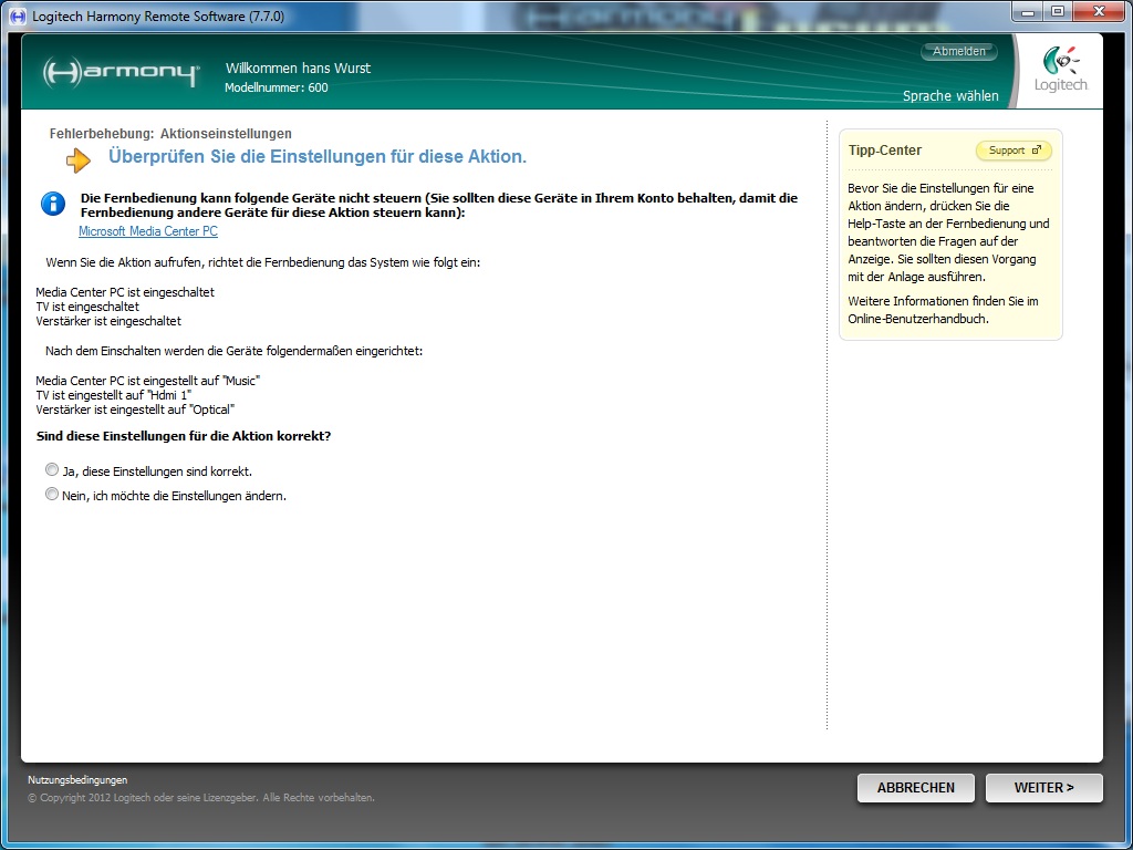 TV, Verstärker und Media center PC sind nur als geräte eingespeichert