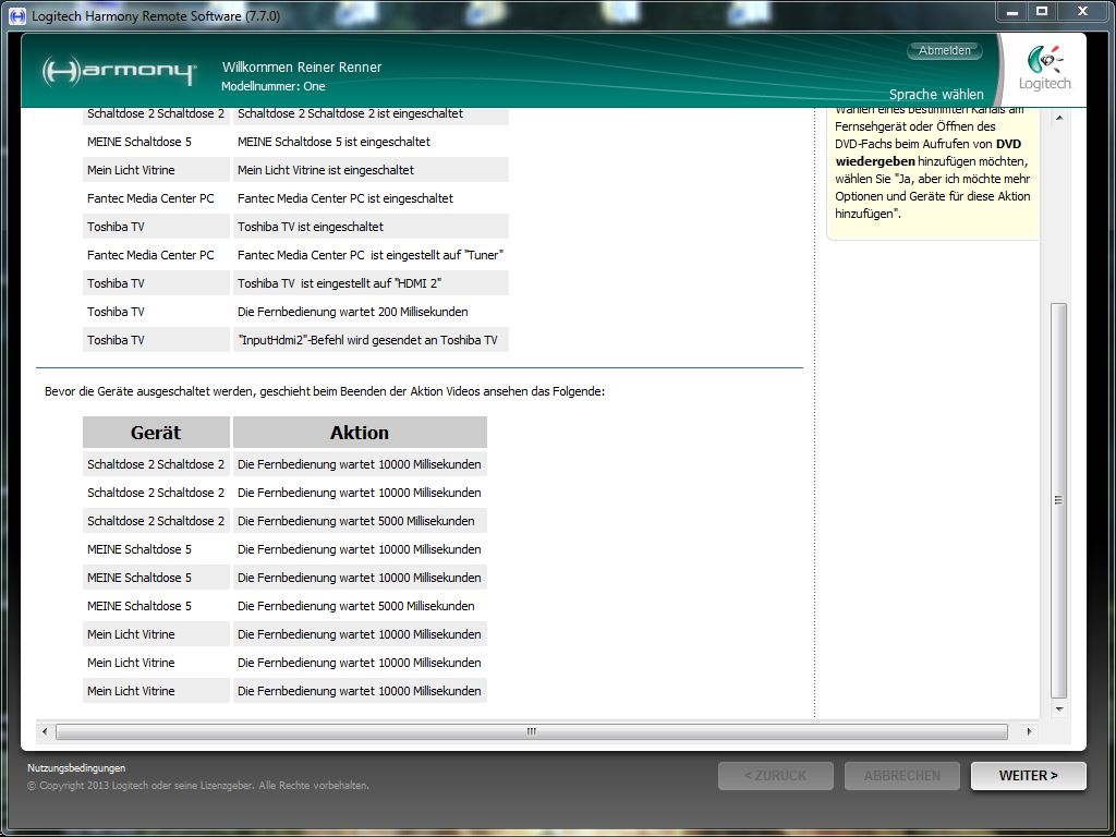 Hat aber den Nachteil, dass die Harmony bei Wechsel von Aktionen für die Zeit der Verzögerungen für die Bedienung gesperrt ist.