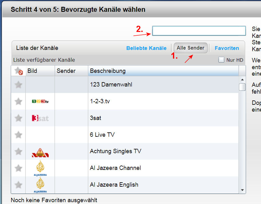 Um hier möglichst schnell an's Ziel zu kommen, wählen wir zuerst den Reiter "Alle Sender" (1) aus.