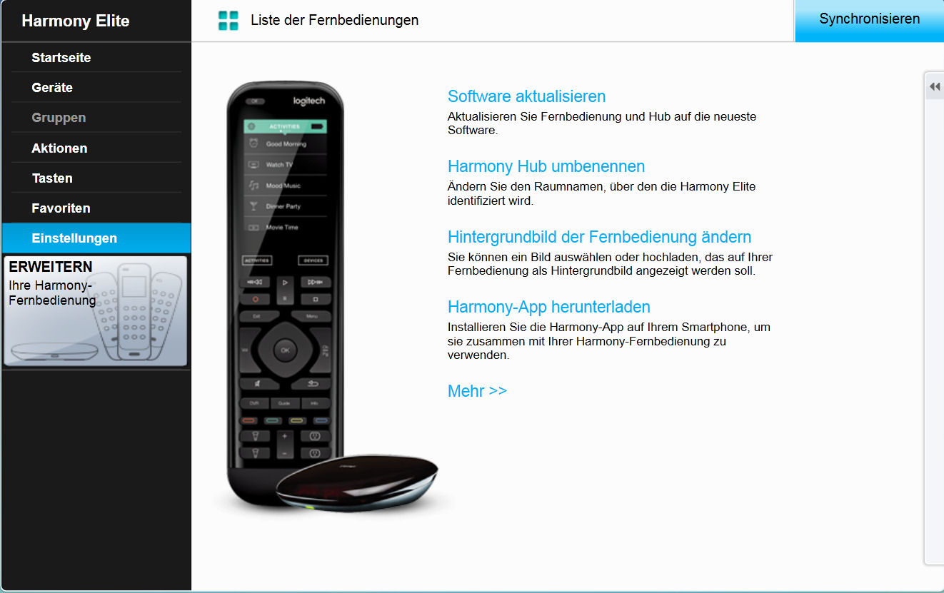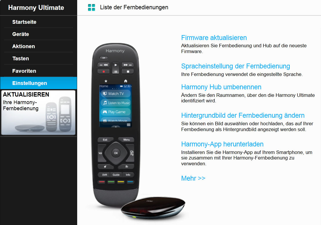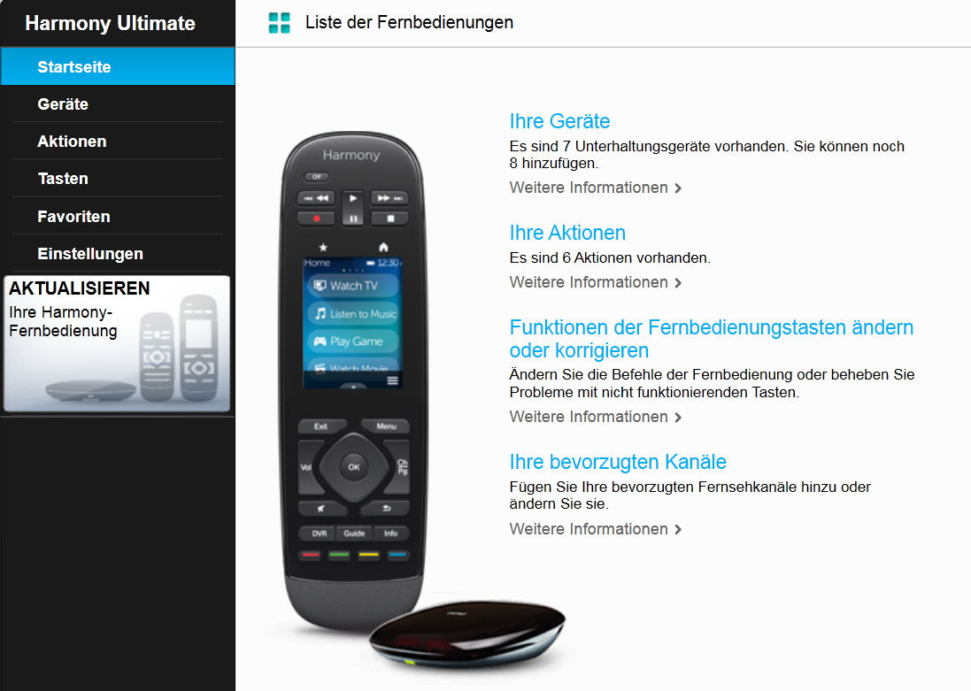 Links im schwarzen Fenster sehen wir die einzelnen, tiefergehenden Punkte (Geräte, Aktionen, Tasten, Favoriten, Einstellungen), die -bis auf den Punkt Einstellungen- etwas detailierter mitte-rechts auf der Seite selbst dargestellt werden.