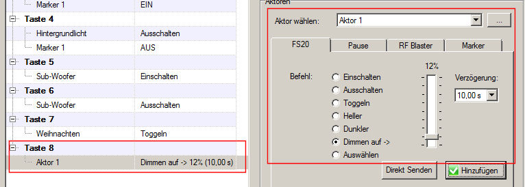 3. Jetzt gehst Du dort zurück auf "FS20", suchst Du den gewünschten FS20-Dimmer aus, wählst den %-Wert und klickst auf "Hinzufügen"