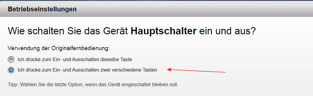 Da wir zum Ein- und Ausschalten des Gerätes nur den PowerToggle-Befehl haben, müssen beide Verzögerungen - also die zum Verzögern nach dem Einschalten und die zum Verzögern vor dem Ausschalten- vorhanden sein.