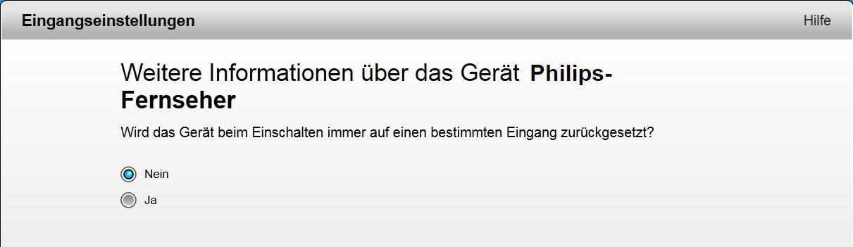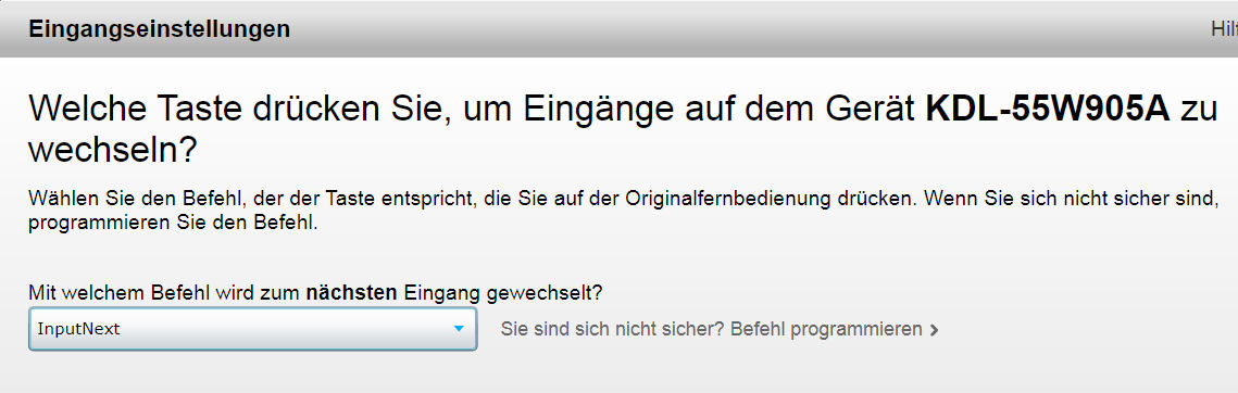 - Im Folge-Bild wird hier der Befehl ausgewählt, der direkt zum nächsten Eingang springt. Meist ist dies der Befehl InputNext. Danach folgt die Liste der Eingänge. Diese muss exakt so aufgebaut sein, wie sie am Gerät selbst erscheint. Als Letztes folgt die Frage, ob nach dem Einschalten des Gerätes immer ein bestimmter Eingang aktiviert wird: Falls ein immer bestimmter Eingang nach dem Einschalten aktiviert wird, wählen wir Ja und danach den jeweiligen Eingang: