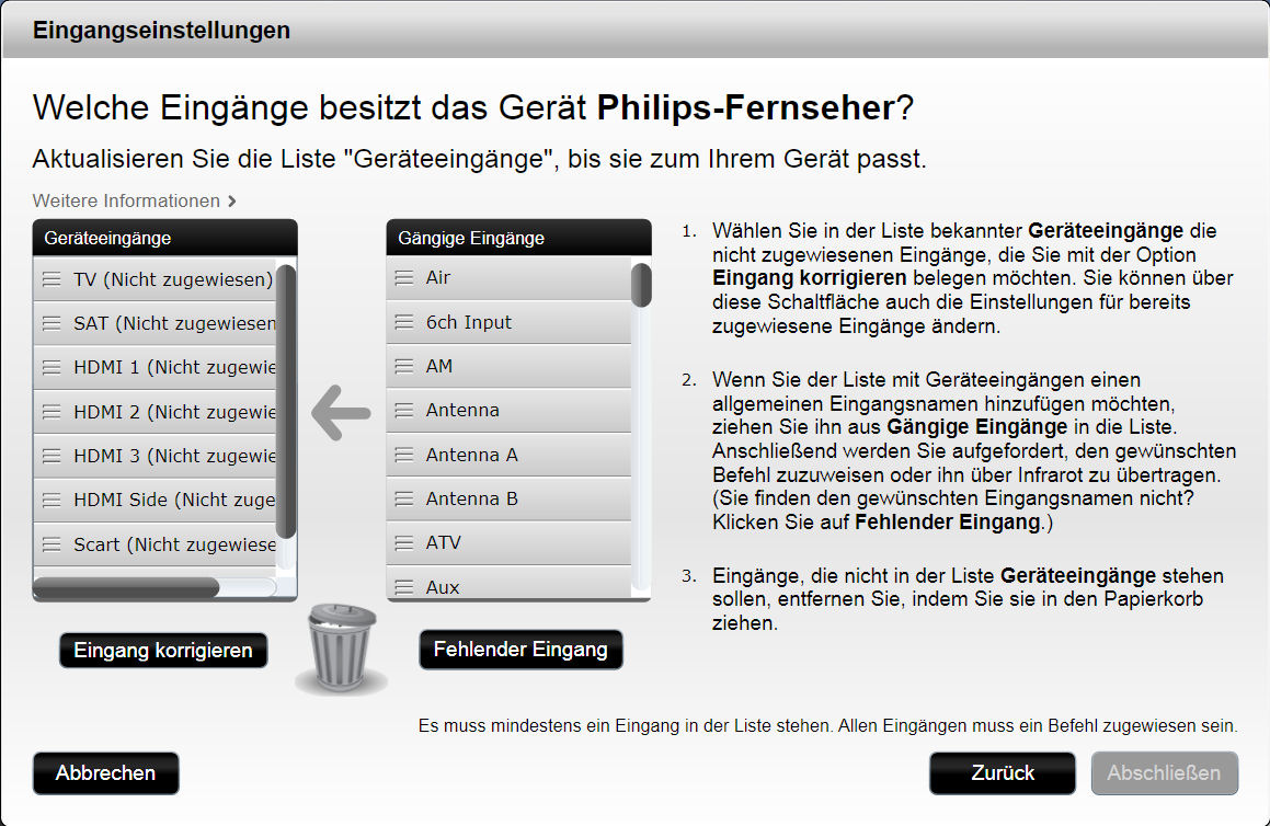 Hier sehen wir links die zur Verfügung stehenden Eingänge und welchem Befehl sie zugeordnet sind. In meinem Beispiel hier ist noch keinem Eingang ein Befehl zugeordnet.