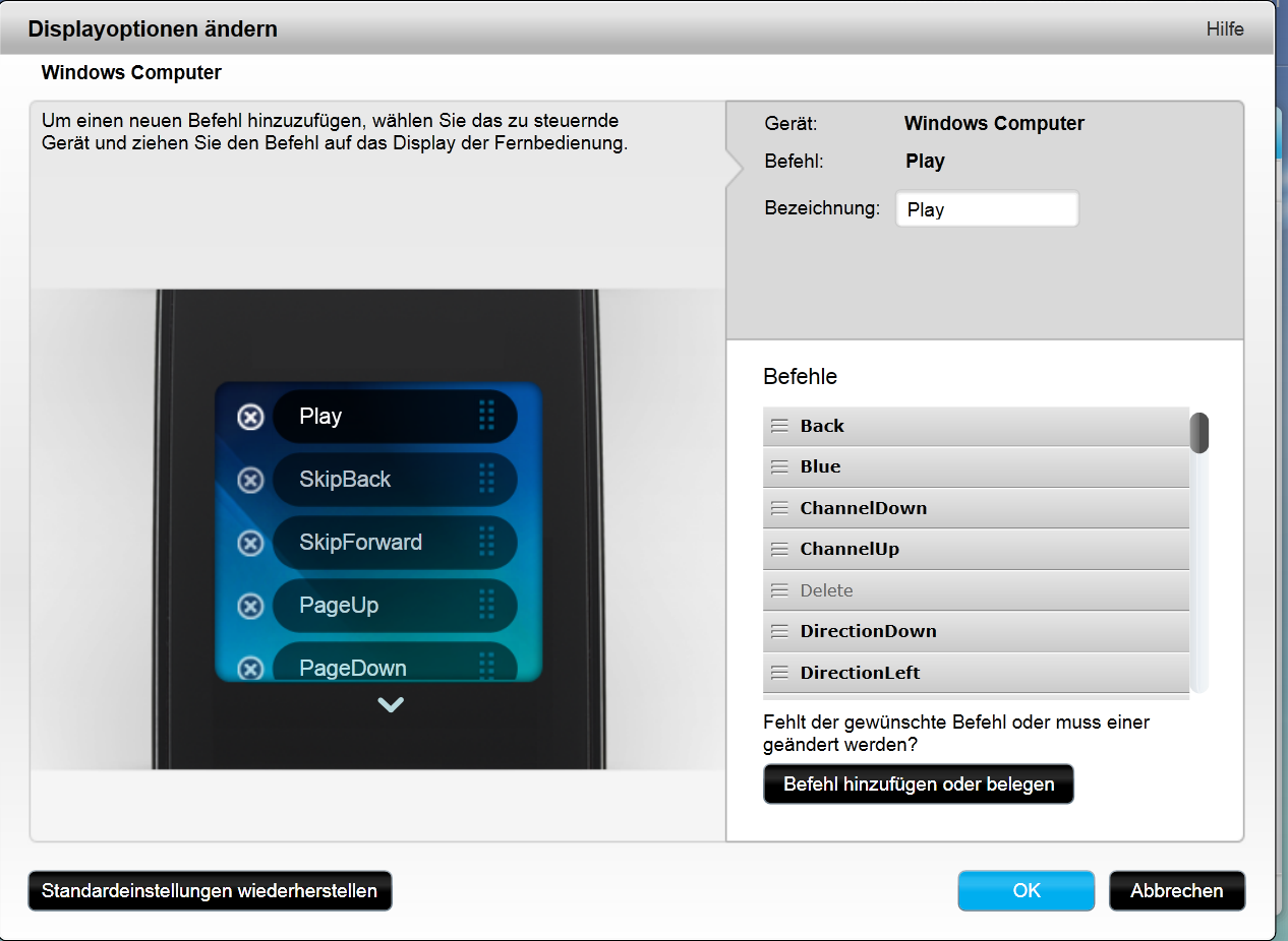 Bei der Ersteinrichtung hat die Software scheinbar auch meinen PC erkannt, auf dem die Einrichtungssoftware läuft. Ist ja mal ne schöne Sache. Auf der Fernbedienung bekomme ich für das Gerät auch verschiedenste Befehle angezeigt, jedoch sind die alle ausgegraut.