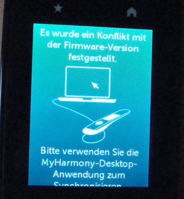 habe das gleiche Problem. Heute ausgepackt und "Es wurde ein Konflikt mit der Firmware-Vesion festgestellt. Bitte verwenden Sie die MyHarmony-Desktop-Anwendung zum synchronisieren"