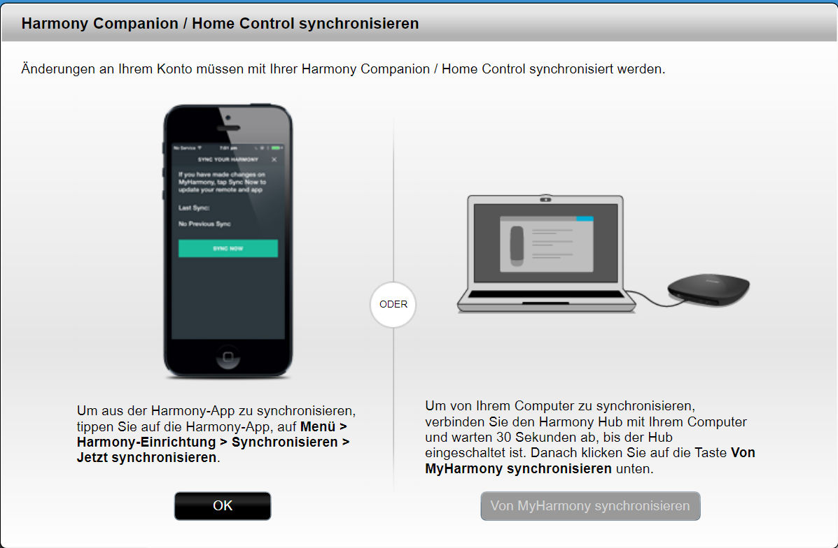 MyHarmony erkennt anhand der ersten Änderung, dass eine Synchronisation angesagt ist.