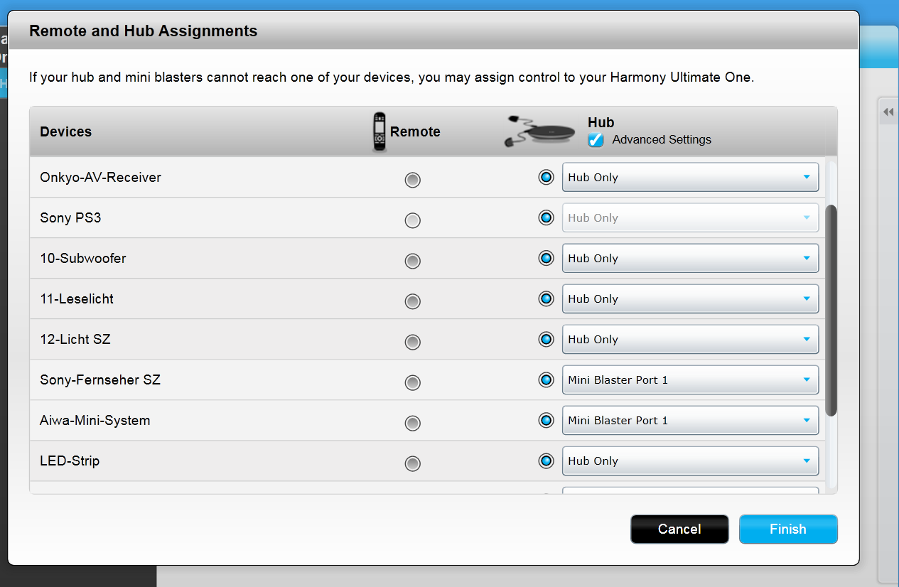 Du kannst jedem Gerät einen der beiden Mini Blaster-Ports, den Hub oder der Fernbedienung zuordnen.