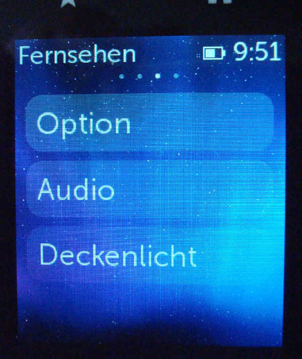 Start-Bildschirm mit der Übersicht der Aktionen: Display mit Befehlen innerhalb einer Aktion: Display mit Befehlen innerhalb eines Gerätes: Display mit einigen wenigen Favoriten: Der Ziffernblock: