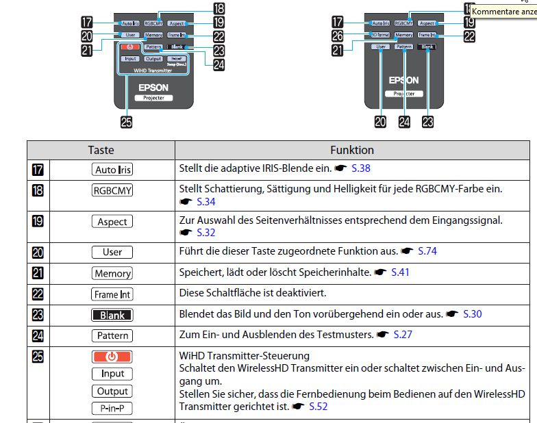 Auszug aus dem Manual zum EPSON EH-TW6100W. Befehle für den WiHD-Sender