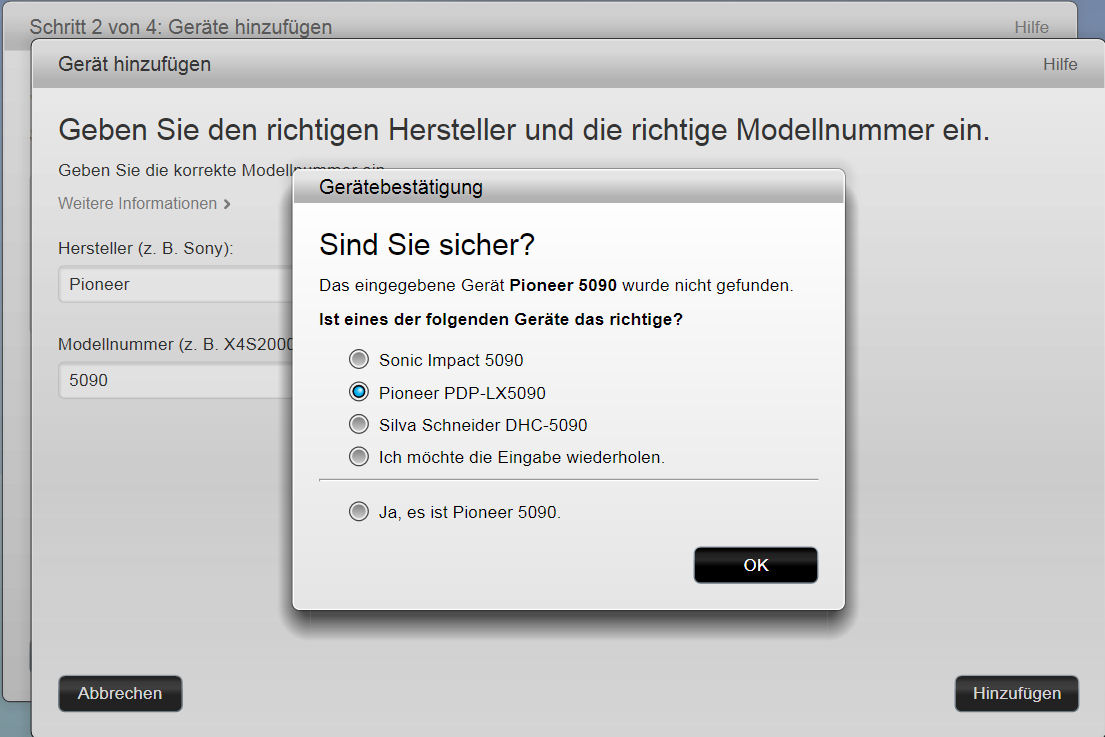 Sollte ein Gerät mehrere Befehls-Sätze in der Datenbank haben, wird euch dies mit diesem Fenster mitgeteilt: