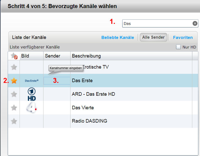 Danach klicken wir einmal auf den gewünschten Eintrag (2) [das Sternchen wird goldfarben] und tragen als Letztes noch den Sender-Platz bzw. die Kanal-Nummer ein (3).