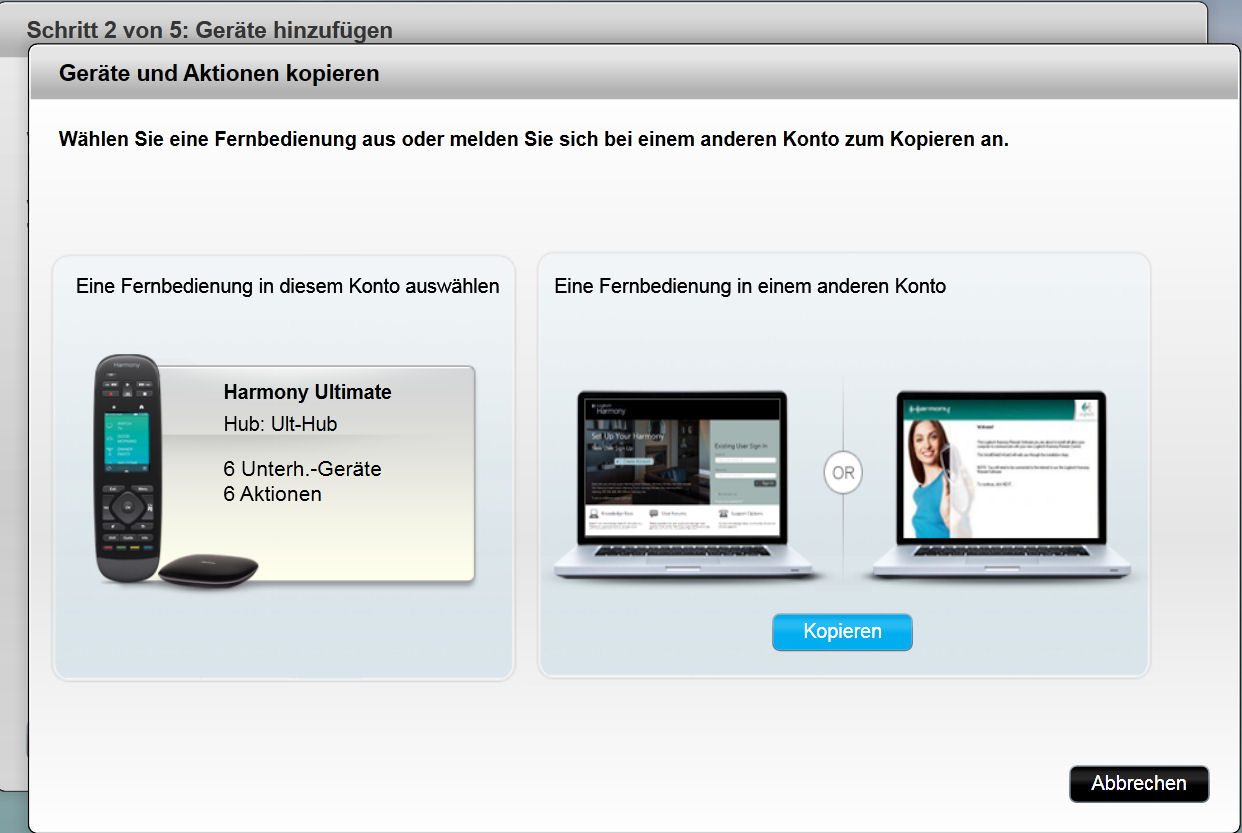 Wenn ihr also z.B. eure Harmony-One-Konfiguration übernehmen wollt, ist dies hier möglich. Im nächsten Schritt wählt ihr aus, von wo -aus dem aktuellen Konto [linke Seite] oder aus einem anderen Konto [rechte Seite]- der Import erfolgen soll.