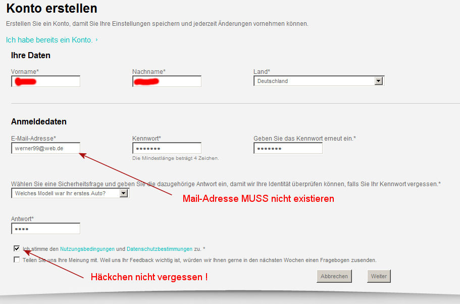 Benutzt ihr eine nichtexistente Mail-Adresse, könnt ihr später natürlich auch nie die Login-Daten anfordern, da diese an die angegebene, aber nicht existierende Mail-Adresse geschickt würden.