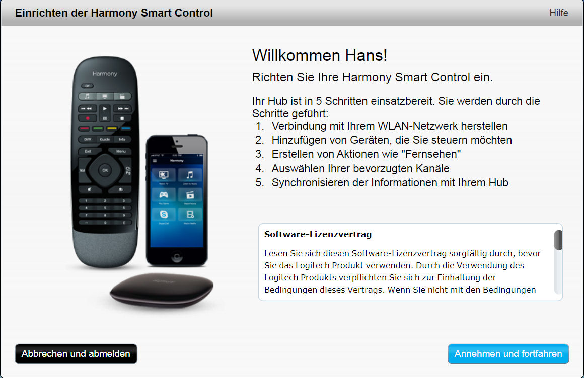 Achtung: In dieser Anleitung beziehe ich mich auf die Smart Control, weil diese alle Bereiche der Ersteinrichtung durchläuft, während andere Harmony's (z.b. die 650) einiges nicht benötigt (Beispiel: WLAN-Einrichtung).