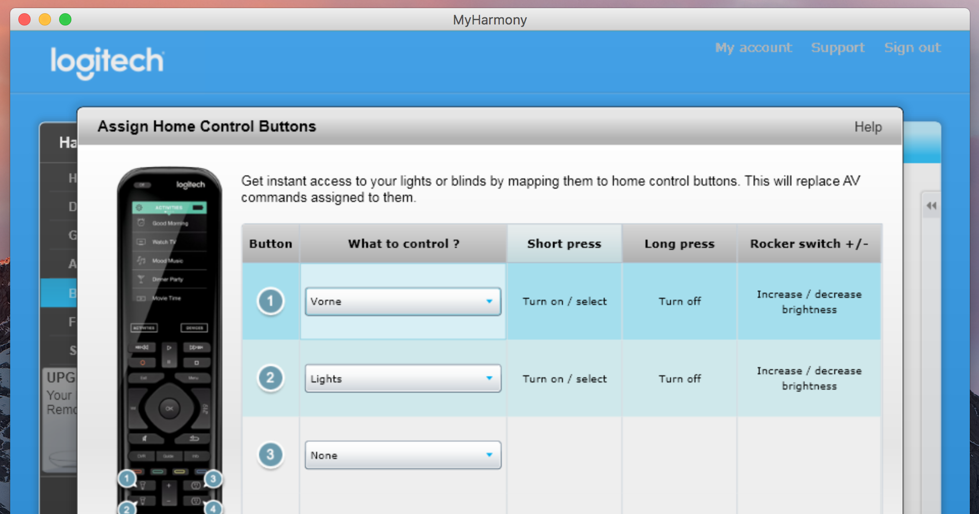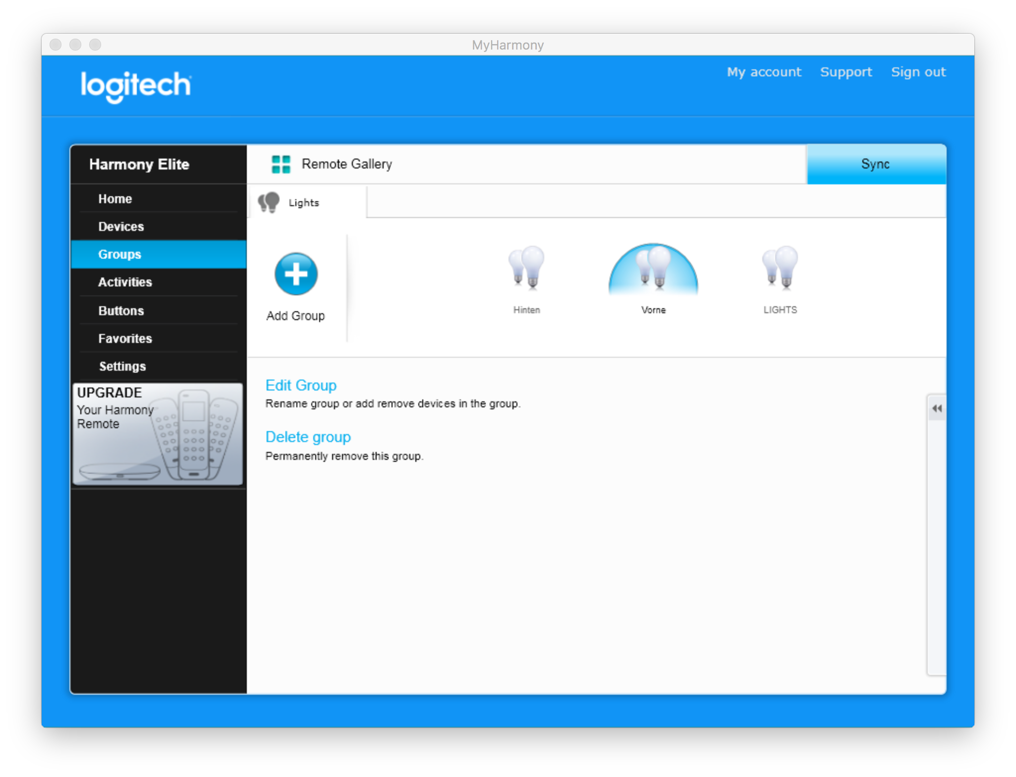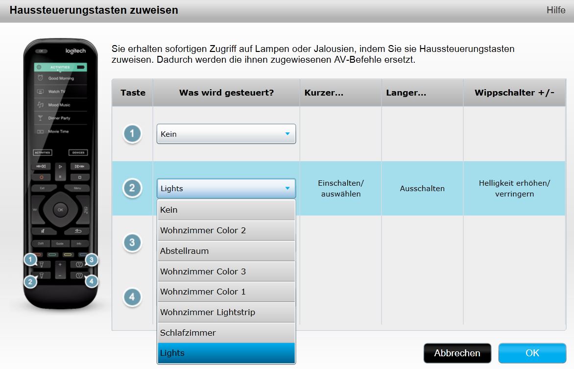 Ich würde gerne mit meiner Harmony ausschließlich die Birnen im Wohnzimmer steuern, und zwar alle gleichzeitig. Das heißt, ich möchte auf die Funktionstaste ganz unten links den ein- und ausschalt Befehl legen. In der MyHarmony Software kann ich da aber entweder pro Taste nur eine Birne legen, oder "Lights", was anscheinend für alle mit der Bridge verbundenen Lampen steht.