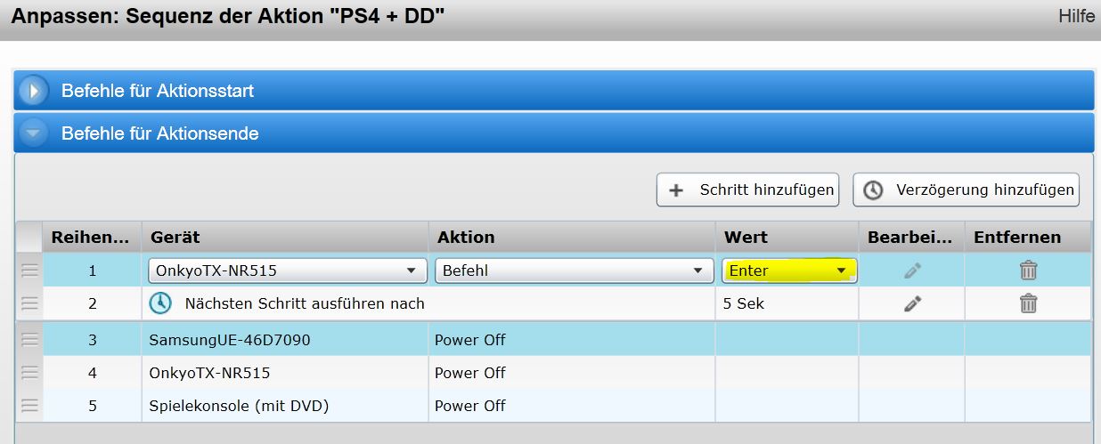 Wähle ich dann die Aktion "PS4+DD" (Playstation mit DolbyDigital, also aktiven Receiver), schaltet sich normal der Receiver mit an, geht auf Eingang Game und ich kann in Ruhe spielen. Beende ich diese Aktion wechselt der Receiver noch auf InputSAT, damit ich beim nächsten mal TV schauen direkt ohne zusätzliches anschalten des Receivers ein Bild habe.