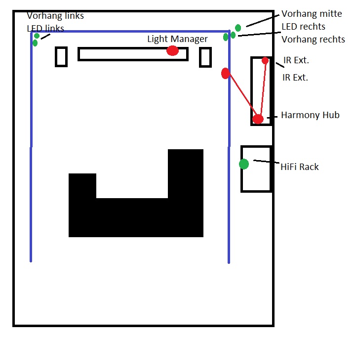 Das Hub steht auch seitlich erhöht auf einem Regal, ein IR Extender musste ich so stellen, dass ich die elektrische Vorhangschiene in der Front ansteuern kann, da der IR Empfänger davon rechts in der Ecke hängt. Der zweite Extender lag neben dem AVR und dadurch konnte ich die Geräte durch den Vorhang auch ohne Probleme steuern, nun aber musste ich den IR Extender vom AVR wegnehmen und ihn so platzieren, dass ich damit den Light Manager in der Front ansprechen kann.