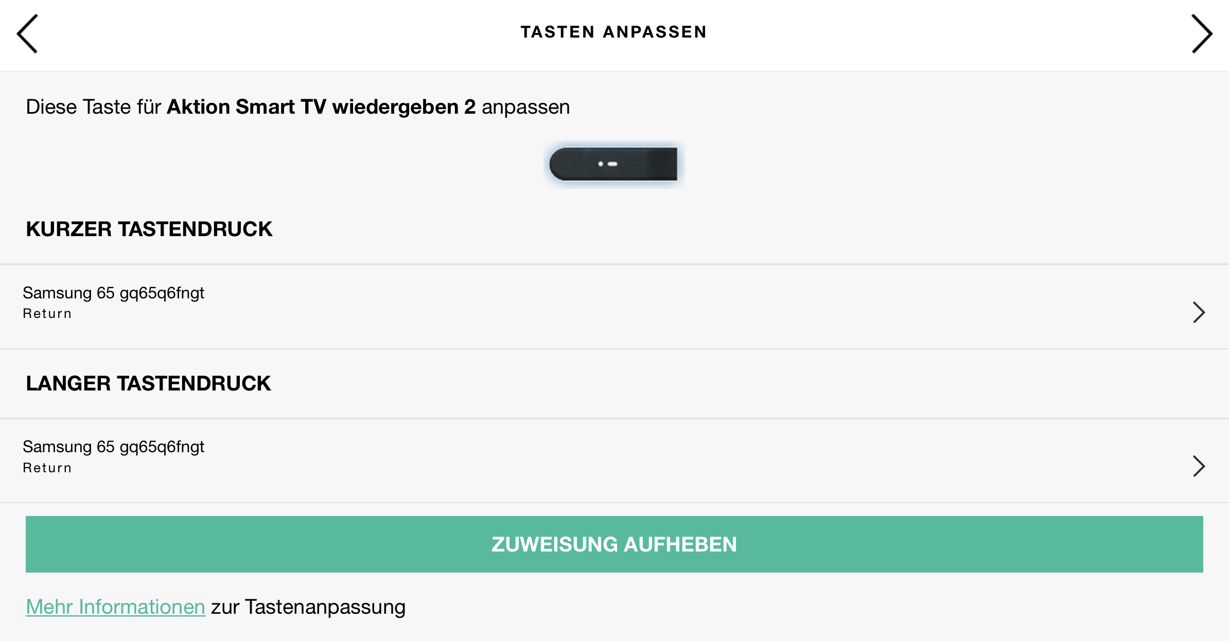 immer wenn ich diese taste über die ios app festlege, hat diese dennoch keine funktion. der fernseher empfängt ein signal, leider keine aktion. habe auch über IR die return taste neu programmiert.