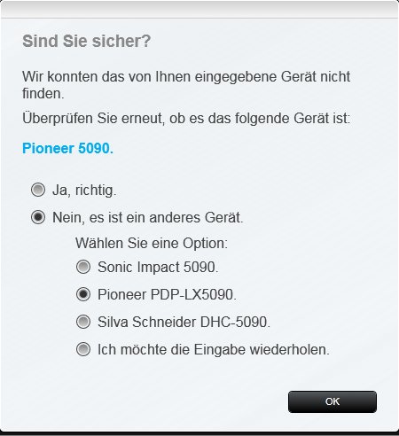 Im ersten Schritt werden die maximal 4 Geräte angelegt: Hierzu benötigt die Software den Hersteller und die Modell-Bezeichnung: Da wir -wie üblich- nur Teile der Bezeichnung eingeben, um das richtige Gerät zu finden, "meckert" sie Software rum. Diese Frage beantworten wir mit "Nein" und kommen dann zu einer weiteren, aber immernoch falschen Geräte-Auswahl ... .. die wir auch wieder mit "Nein" beantworten und wählen "Ich möchte die Eingabe wiederholen": Anm.: Diese Schritte kann man sich natürlich sparen, wenn man etwas mehr von der Bezeichnung eingibt.