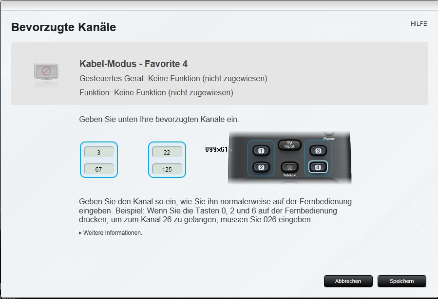 Als erstes wird gefragt, für welches Gerät die "bevorzugten Kanäle" angelegt werden sollen: Im nächsten Bild werden für jede Taste die Kanal-Ziffern eingeggeben: Fährt man später mit der Maus über eine dieser Tasten, zeigt uns die Software die aktuelle Belegung: