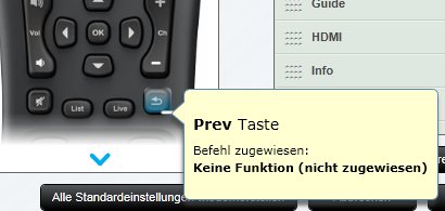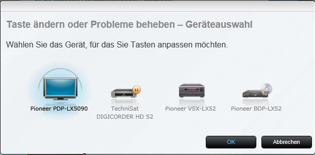 Um den restlichen Tasten eine Befehl zuzuweisen, ziehen wir ihn einfach aus der Befehls-Liste auf die gewünschte Taste: Fährt man mit der Maus über eine Taste, wird die aktuelle Belegung gezeigt: Nicht belegte Tasten werden so sichtbar gemacht ... ... und sehen nach der Zuweisung so aus: Das jeweils ausgewählte Gerät erkennen wir durch den Rahmen der oberen Geräte-Tasten: Wollen wir nun Befehle eines anderen Gerätes auf Tasten legen, reicht ein Klick auf den gewünschten Geräte-Button: So sehen Tasten aus, die von einem "fremden Gerät" belegt wurden: Hier können wir auch die Lautstärke-Regelung der Geräte festlegen (Schaltfläche "Einrichtung" anklicken"): Hiermit legen wir fest, auf welches Gerät die Lautstärke-Tasten wirken sollen.