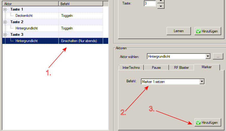 Ausgangssituation für die weitere Einstellung ist, dass wir jeweils eine Taste zum Ein- und Auschalten der Hintergrund-Beleuchtung definiert haben: Im ersten Schritt setzen wir die Taste 3 (Einschalten) auf "Nur abends" (rechte Maustaste auf den Aktor): Das sieht dann so aus: Im nächsten Schritt setzen wir für diese Taste den "Marker 1".