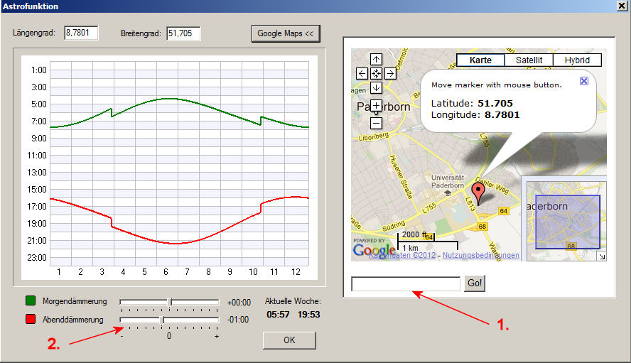 Wir rufen also die Astro-Funktion auf ... ... und klicken auf "Google Maps": Im folgenden Fenster geben wir nun unseren Standort ein (1). Dies kann entweder nur der Wohnort (Beispiel: Hamburg) sein oder -um bei großen Städten möglichst exakt zu sein- Wohnort und Strasse getrennt durch ein Komma (Beispiel: Hamburg, Hauptstrasse) und klicken auf "Go": Längen- und Breitengrad sind nun aktuell und wir sehen anhand die beiden Kurven für Morgendämmerung (grün) und Abenddämmerung (rot), wie sich die Zeiten hierfür Tag für Tag verändern werden.