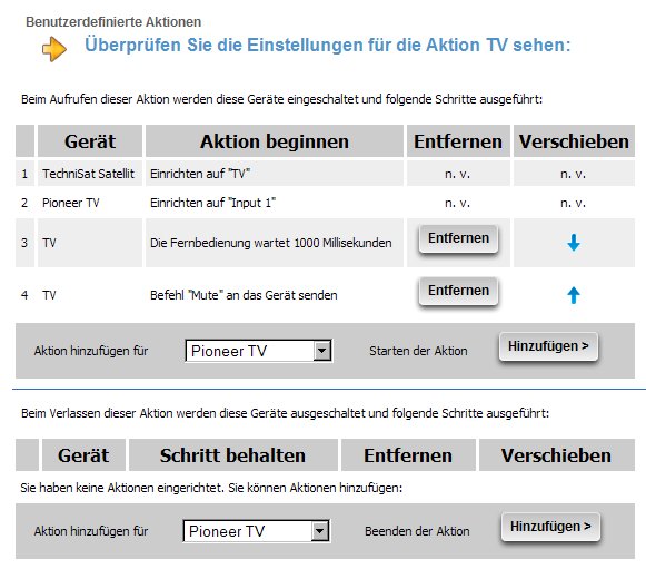 Für den TV z.B. sieht das Ganze dann so aus: Und so für z.B. den SAT-Receiver: In meinem Beispiel habe ich eine Verzögerung von 1 Sekunde eingebaut und sende danach dann das MUTE-Signal an den TV: Natürlich lässt sich die Reihenfolge der Befehle mit den blauen Pfeilen noch verändern (Befehle können verschoben werden) und natürlich lassen sich falsche Befehle auch wieder löschen (Entfernen).