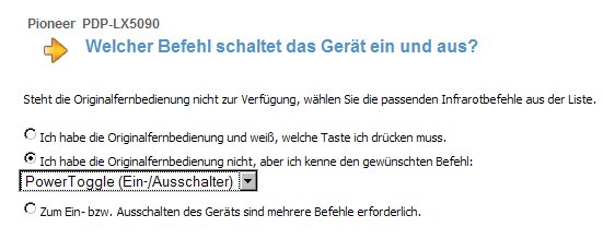 * Welcher Befehl schaltet das Gerät ein und aus? (Betriebs-Einstellungen; Zuweisung des/der Power-Befehle)