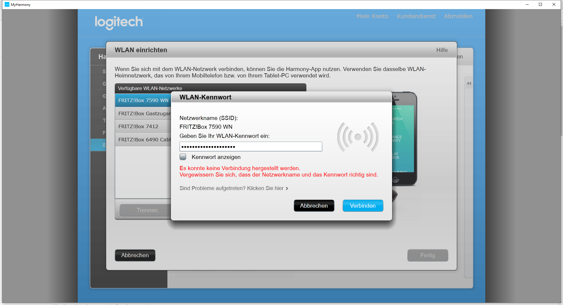 So sollte sie dann auch im Auswahlfenster der WLAN-EInstellungen in MyHarmony auftauchen.