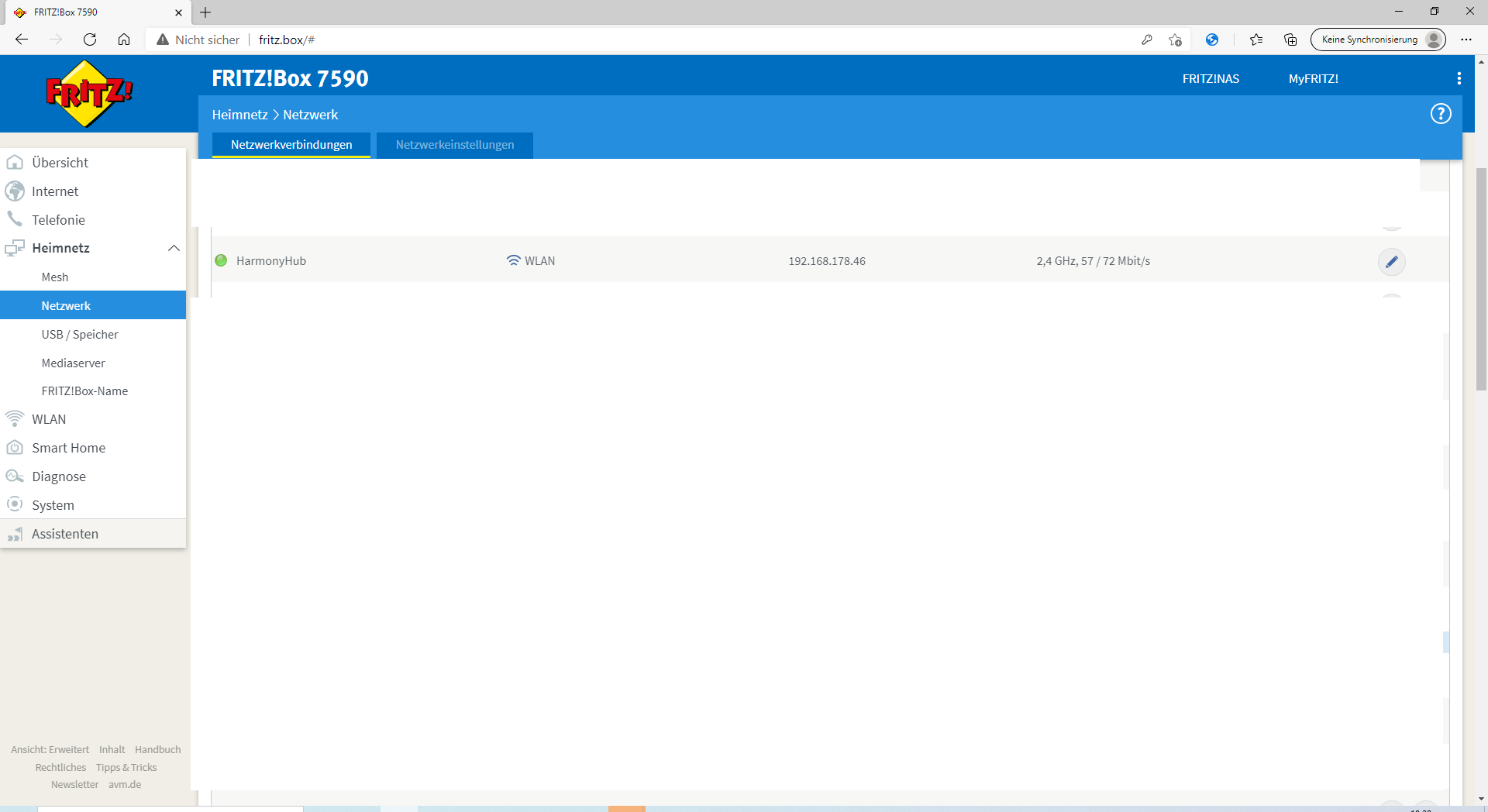 Außerdem wird der HUB auch in den Netzwerkgeräten der Fritz!Box als verbunden angezeigt solange der Verbindungsversuch läuft. Nach dem scheitern dann wieder in den ungenutzten Verbindungen.