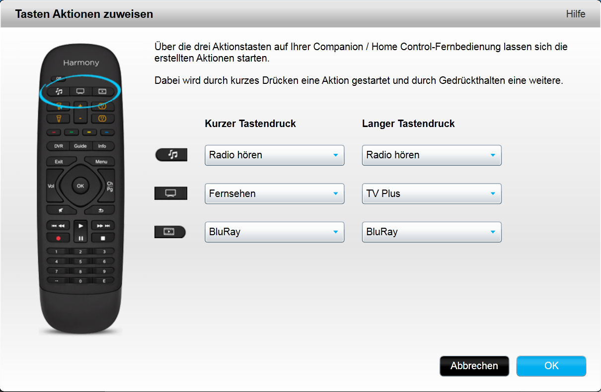 Ist bei myharmony halt nicht mehr wie bei der Software das man erst Gerät/Aktion wählt und dan die Tastenbelegung, sondern umgekehrt