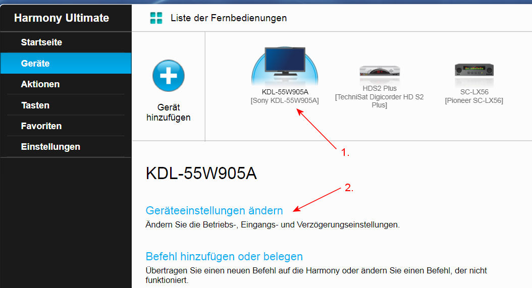 Innerhalb des Kontos klicken wir auf Geräte. Danach wählen wir das gewünschte Gerät aus (1) und gehen dann auf Geräteeinstellungen ändern (2). Im Folge-Bild wählen wir nun den Punkt Eingangseinstellungen aus. ACHTUNG: Sollte dieser Punkt hier nicht erscheinen, ist eine Änderung der Eingangs-Wahl bei diesem Gerät nicht möglich.