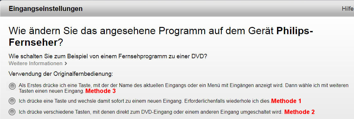 Methode 3: Diese Methode benutzt das Menü des TV's, um den gewünschten Eingang anzusprechen. Sie ist damit schneller als Methode 1, jedoch nicht so schnell wie Methode 2. Voraussetzung für diese Methode ist, dass ein Befehl für den Aufruf des TV-Eingangsmenü's vorhanden ist.